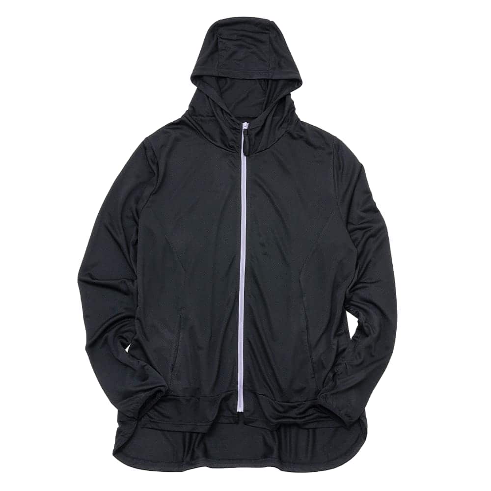 また、紫外線カット率は90%以上と高水準。強い日差しの中でも安心して着られるので、日焼けが気になる方にもぴったりです。吸汗速乾機能も備えており、汗をかいてもすぐ乾いてサラッとした着心地が続くのもポイント。デザインはフルジップ仕様で、さっと羽織れて着脱もラクラク。後ろはヒップが隠れる長め丈で、体型カバーにもひと役買ってくれます。