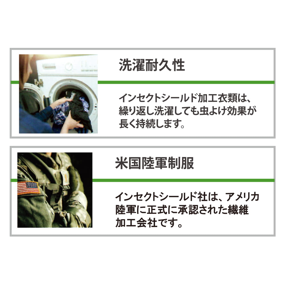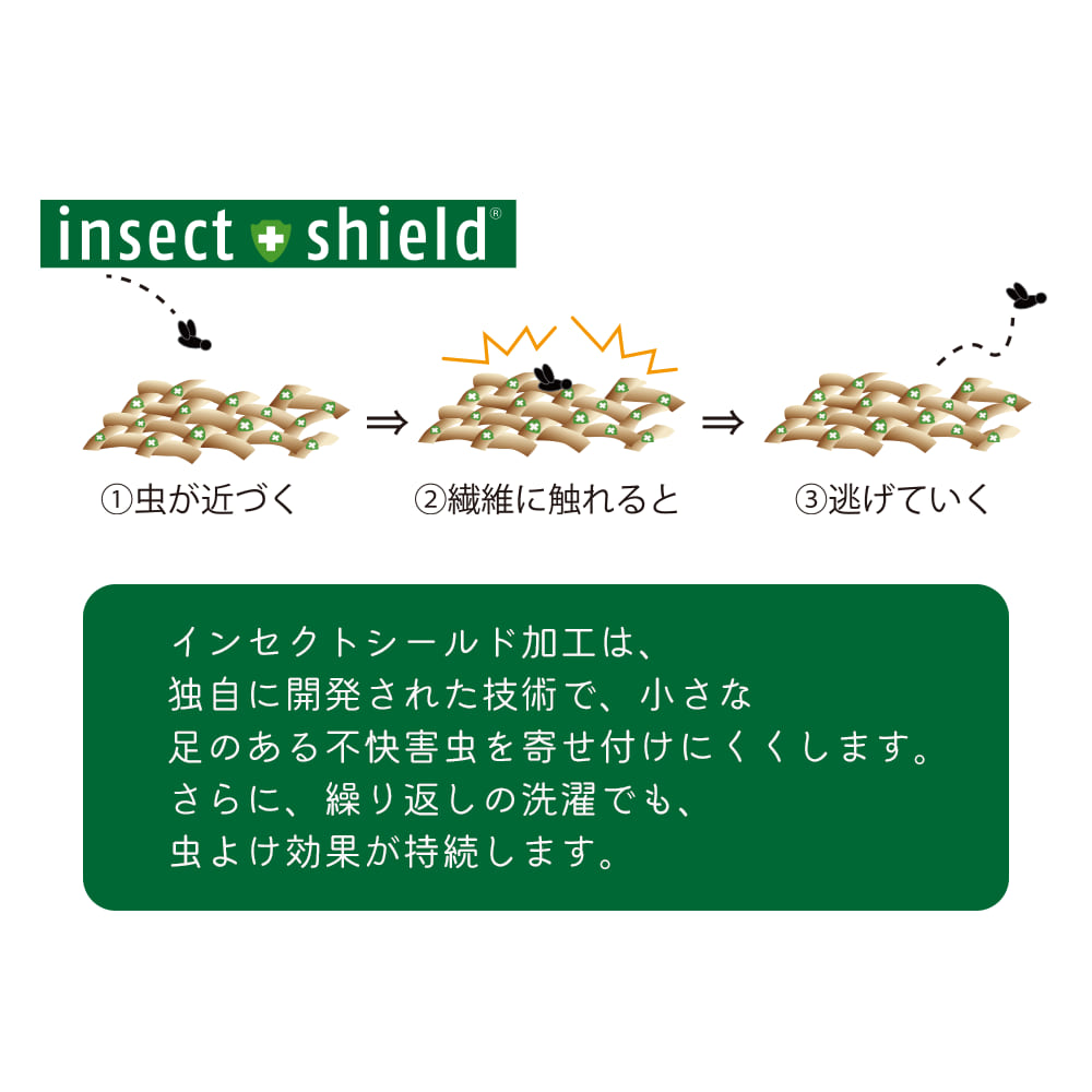 最大の特徴は、防虫加工に使われている「インセクトシールド(ペルメトリン加工)」。これは米国陸軍の制服にも採用されている実力派の防虫技術で、小さな虫が近づいてもとまらずに逃げていくという虫よけ性能。しかもこの加工は繰り返し洗濯しても効果が持続するため、シーズンを通してしっかり活躍してくれそうです。