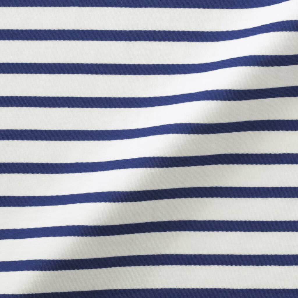 無印良品の「婦人 ボーダーボートネック半袖Tシャツ」は、シンプルながらも細部にこだわった一枚です。オーガニックコットンを使用し、二本の糸を引きそろえて編むことで、柔らかく程よい厚みのある生地に仕上げられています。この製法により、カジュアルな素材感ながらも毛羽立ちを抑え、きれいな表面感を実現しています。