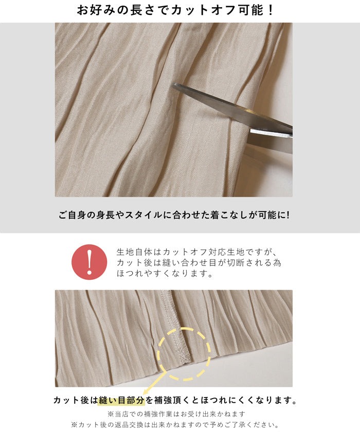 注目したいのは「セルフカット」対応の仕様。ご自身の身長やスタイリングに合わせて好きな長さにカットして着用することができます。切った後は縫い目部分がほつれやすくなるため、縫い目の補強をおすすめしますが、自分好みの丈感ではけるという自由度の高さはうれしいポイントです。また、ポケットも付いているのも◎。