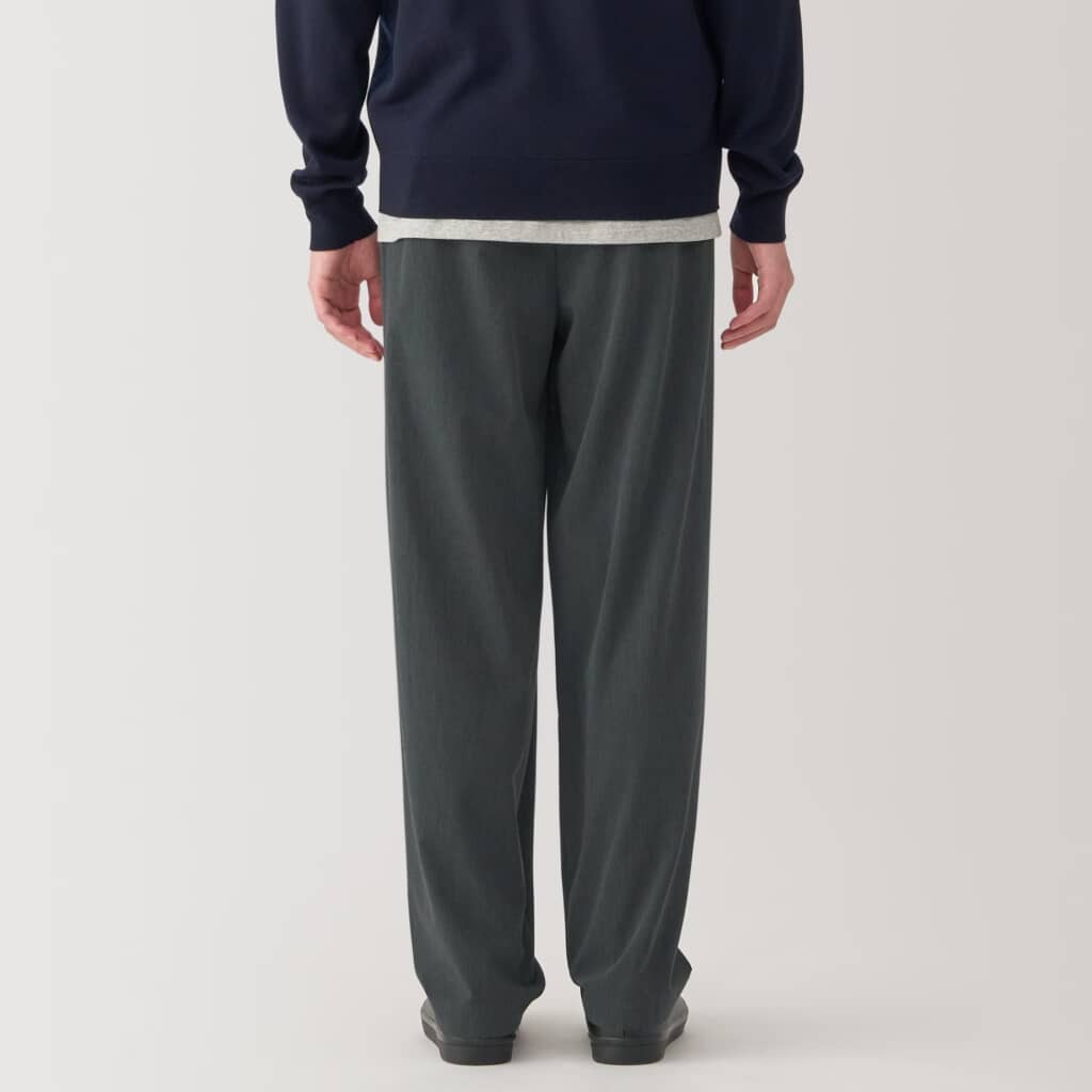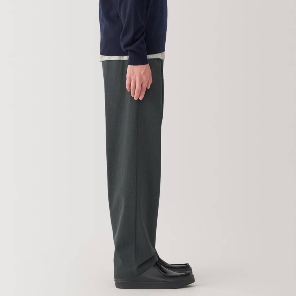 無印良品の「紳士 乾きやすいイージータックワイドパンツ」は、ペットボトルを再生した糸を使ったウール調ファブリックを使用したアイテム。シワになりにくく洗濯後も短時間で乾くので、梅雨の時期も毎日気兼ねなく着用することができます。