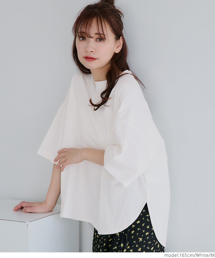 注目ポイントは、やはり今っぽさを演出してくれるビッグシルエット。肩を落としたドロップショルダーに、身体のラインを拾わないゆったりとした身幅で、抜け感のある着こなしが簡単に完成します。気になる二の腕をさりげなくカバーしてくれる5分袖は、体型を選ばず、1枚で着ても安心の絶妙なバランス感。カラー展開も豊富で、ベーシックなホワイト、ブラック、チャコールから、爽やかなブルー、やさしいイエローまで全6色がラインアップ。「何枚あっても困らない」と、色違いでそろえるリピーターも多いようです。