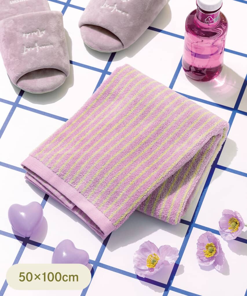 第1位は、「ミニバスタオル:50×100cm」(税込み:770円)でした。綿100%でふんわりとした優しい肌触りが魅力のタオルです。シンプルなストライプ柄は性別問わず使いやすいデザインで、日常使いはもちろん、ギフトにもおすすめ。便利なハンガーループ付きで、フックなどに掛けることができるのも便利です。ミニバスタオルのほか、ハンドタオル・フェイスタオル・バスタオルとサイズ展開も豊富。全色そろえたくなりますね。