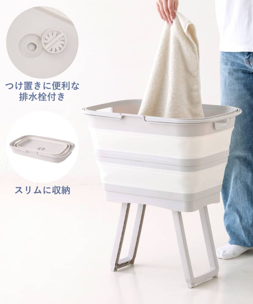 以下からは、「スタンド付き折りたたみ洗濯カゴ」の詳細画像と「使い勝手の良い洗濯グッズ10選」を紹介します!