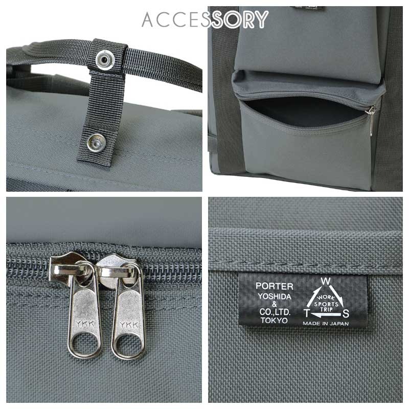 工具用のバッグや腰袋をモチーフにしたフロントポケットのデザインが特徴で、リベット(鋲)を効かせた無骨でインダストリアルな表情と、印象的なネームタグが、PORTERらしい上質な個性を演出しています。