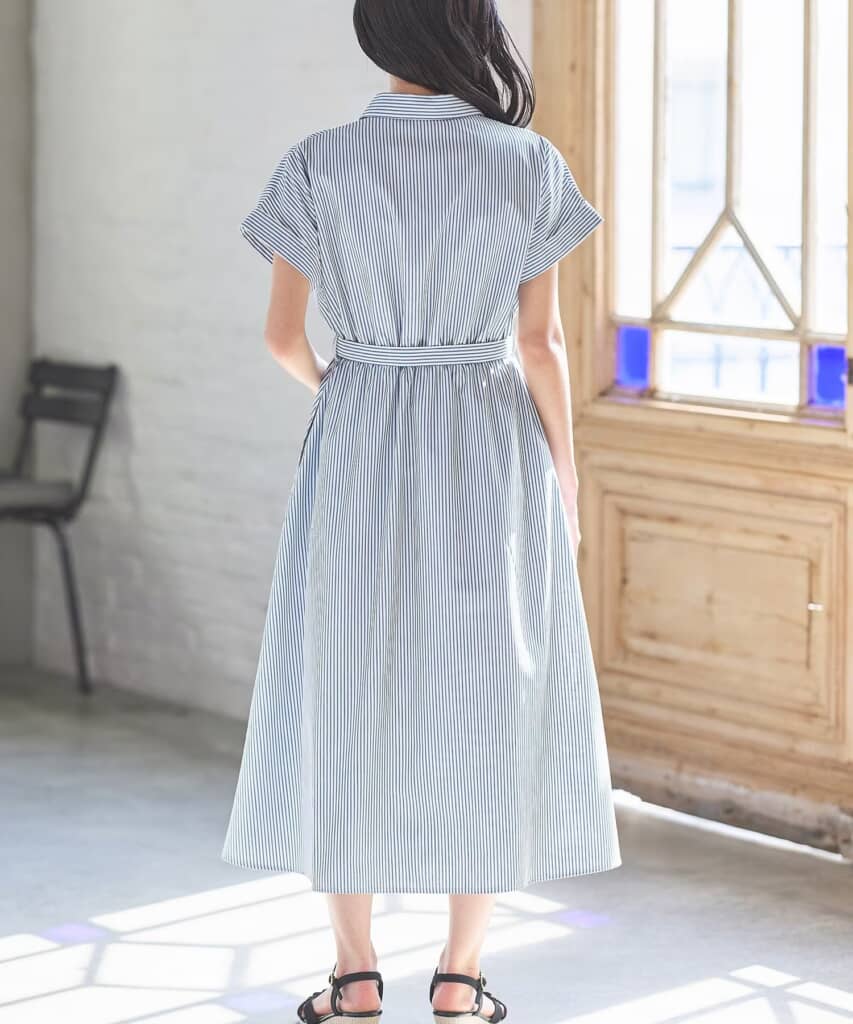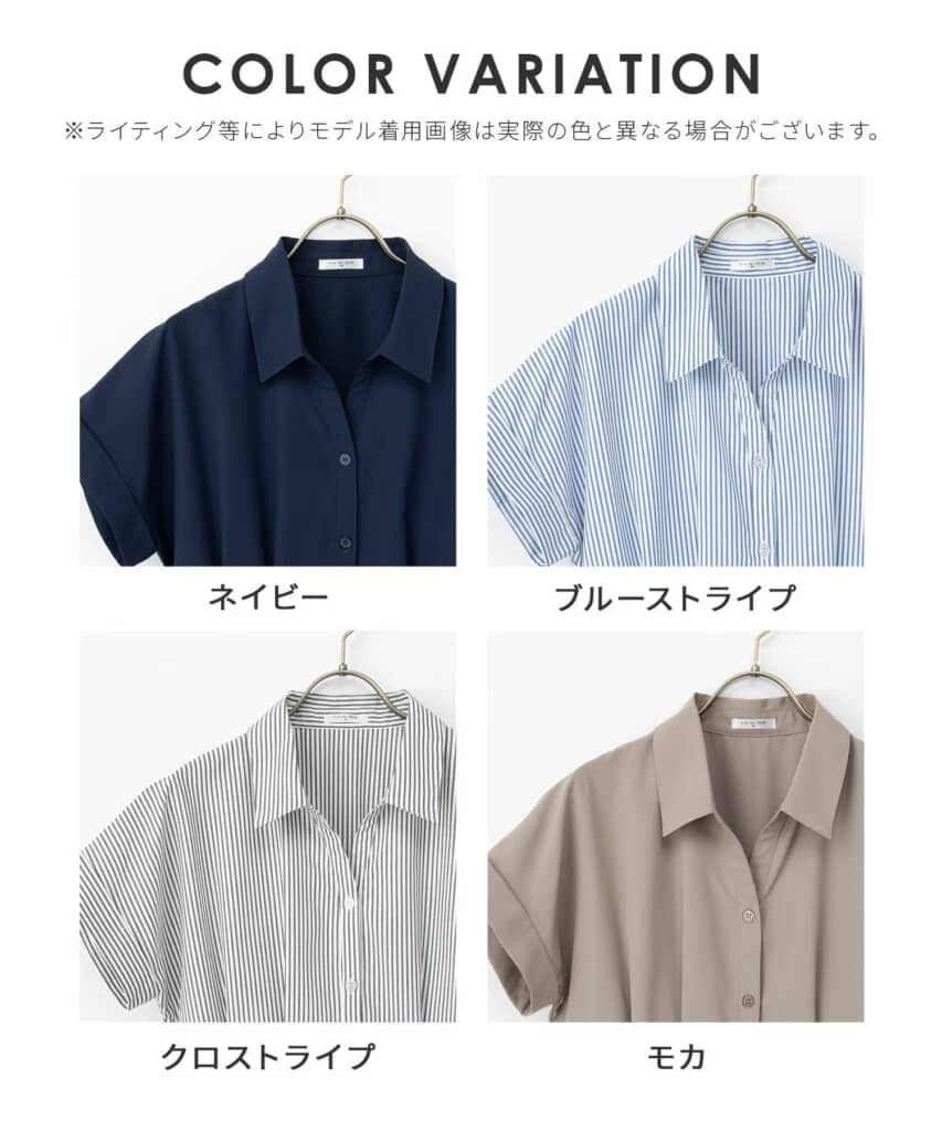 首元はスキッパータイプのベーシックなレギュラーカラーで、すっきりとした印象。ウエストマークでスタイルアップしてくれるのもうれしいポイントです。生地にはしわになりにくく扱いやすい素材を使用し、後ろウエストゴムなので、日常使いにストレスなく取り入れられるでしょう。
