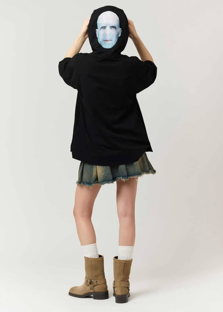 話題となっているのは、「闇の帝王|ミニ裏毛ビッグシルエット半袖パーカー」。フロントにトム・リドルのプリントが施された、一見シンプルなデザインのパーカーですが、フードをかぶると“闇の帝王”ことヴォルデモート卿の顔が現れる、インパクト抜群のビジュアルとなっています。夜中にこれを見たら、言ってはいけない名前をさけんでしまいそう……!