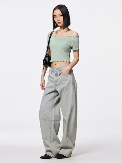 GUから販売されている「ブラフィールクロップドシャーリングオフショルダーT」が、カップ付きで一枚で着られる“楽映えトップス”として人気を集めています。