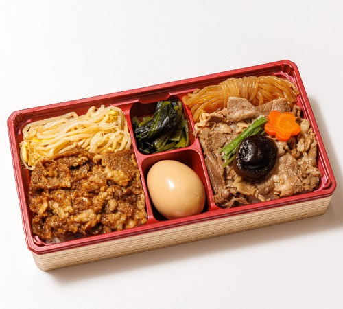 「牛すきと牛焼肉弁当」は、甘辛の関東風すき焼きと網焼き牛カルビを同時に楽しめる駅弁。牛すき焼は国産牛を使用しており、結び白滝煮や飾りにんじんなどがのっています。牛カルビ焼にはもやしナムル、小松菜ナムルなども添えられ、満足度の高い一品に。煮味付き卵が入っているのもうれしいポイントです。