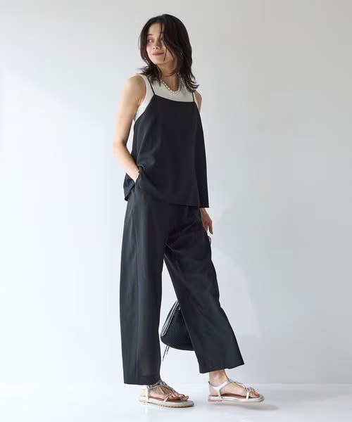 パンツ部分はストレートワイドシルエットで、ラフさとすっきり感を両立。背中がほどよく開いたデザインが抜け感を添え、後ろ姿まで美しく見せてくれます。さらりとしたタッチの吸水速乾素材は、薄手ながら表情豊かな風合いで、ストレッチ性もありシワになりにくいのが特徴です。XS-S(SHORT-36)・FREE・M-L(TALL-38)の3サイズ展開なので、自身のスタイルに合わせやすいのもうれしいですね。