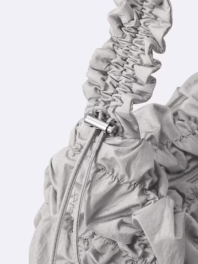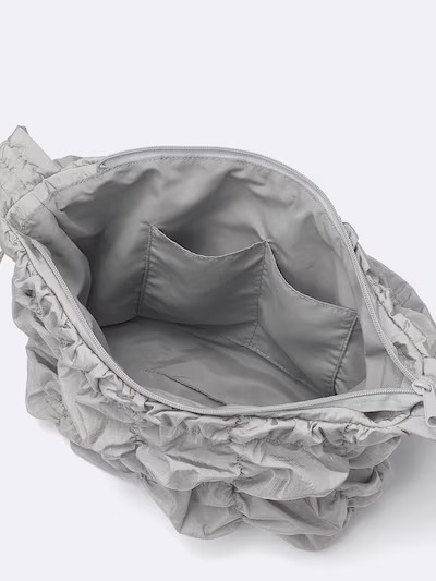 GUの「ギャザーショルダーバッグ」は、立体的なギャザーデザインで高見えするナイロンバッグです。ショルダー部分はドローストリング構造を採用し、長さ65〜95cmまで調節可能。ハンドルを短くすればラウンド型のハンドバッグ、伸ばせば肩掛け・斜め掛けに対応する2way仕様です。内部にはオープンポケットが2つ付き、小物の仕分けも簡単。ファスナー開閉式で中身が見えず、防犯面も安心です。