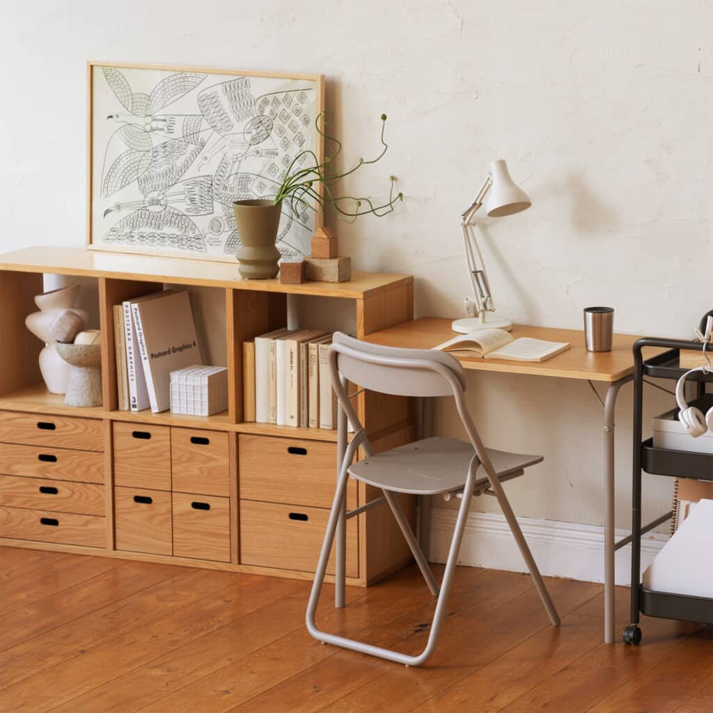 「スタッキングシェルフ・コの字棚」や「スタッキングチェスト・引出し」シリーズなどを組み合わせると、収納力がさらにアップ。シンプルなデザインなので、さまざまなインテリアになじみやすいのもうれしいポイントです。