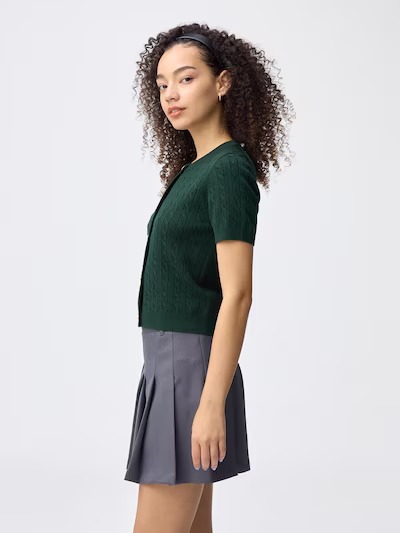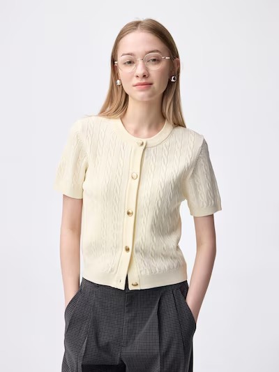 GUから販売されている「ケーブルメタルボタンカーディガン(半袖)」が、高見えする仕上がりとどんなボトムスにも合う万能さから人気を集めています。