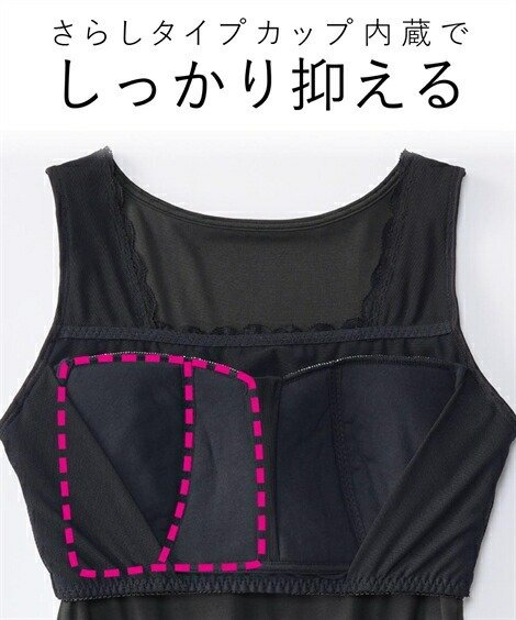本品はカップ一体型のタンクトップ型ブラトップです。2枚はぎカップと胸・背中を包むパワーネットがバストを前後から均一に押さえ、Tシャツでも映える胸元へ導きます。脇高設計とサイドのリフトパネルが横流れを防ぎ、汗ばむ季節でも安定感が持続。