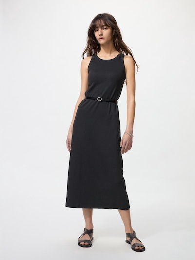 綿ベースの細リブが体に寄り添いながらも締めつけ感は控えめで、肌離れの良い素材が蒸し暑い日でも快適さをキープします。上品なIラインシルエットで、伸びの良いリブのおかげで視覚的にも縦ラインが強調され、スタイルアップ効果が期待できます。1枚で着るのはもちろん、カーディガンやシャツジャケットを羽織ればタウンユースから旅行まで幅広く活躍。スニーカーでカジュアルに、ミュールでレディにと足元次第で印象ががらりと変わります。
