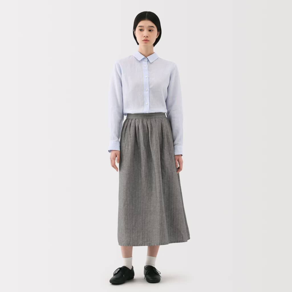 同アイテムは、ヘンプとオーガニックコットンのブレンド生地のスカート。麻特有のシャリ感で風を通し、綿が肌当たりをやわらげるため、汗ばむ日も肌に貼り付きにくいのが魅力です。前面に施したタックが膝下から広がるフレアラインを生み、動くたびに軽やかな揺れを演出します。