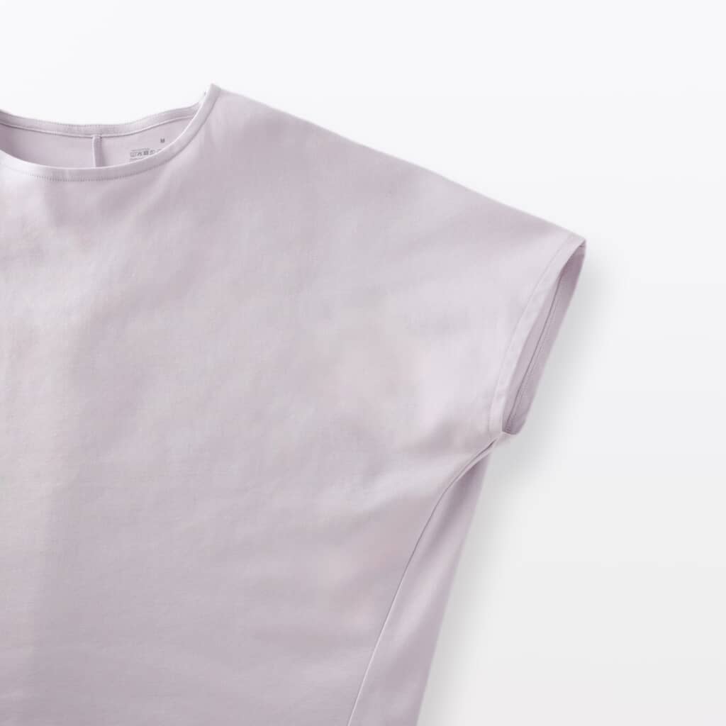肩と袖をひと続きに設計したドルマンスリーブは、二の腕をふんわり包みながら可動域を確保。ほどよくゆとりのあるシルエットが体のラインを拾いにくく、風が抜けて真夏も快適です。