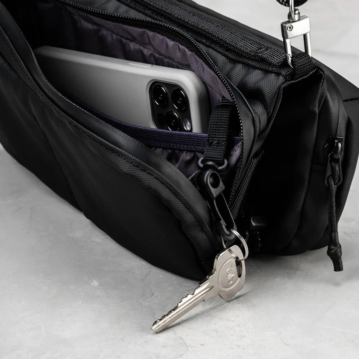 ボトル・傘用の専用コンパートメントに加え、二つのメインファスナー室と小物ポケット、キーフック付きオーガナイザーを備え、500〜1000ミリリットルのペットボトルもすっきり収まります。公式サイトではサコッシュ単体のほか、ショルダーになるストラップがセットになったものもラインアップ。Topologieではほかにもさまざまな種類のストラップを販売しているので、自分好みのストラップと合わせてサコッシュを使用するのもよさそうです。