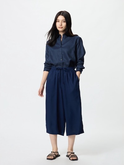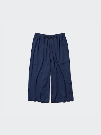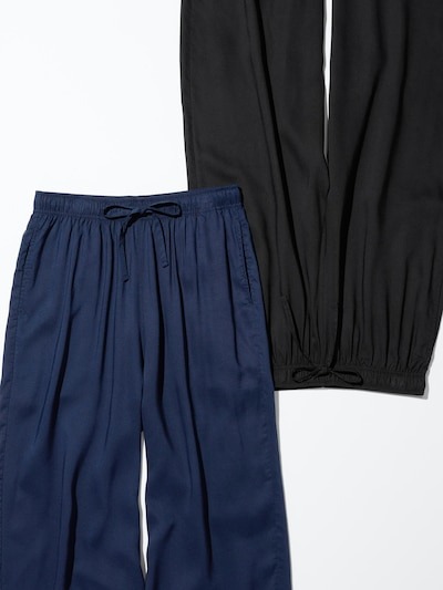 ユニクロの「レーヨンリラコ」は、肌当たりのよいレーヨン100%素材を使用したクロップド丈のパンツ。足さばきのよいシルエットで、ウエストがゴムのため楽に過ごせるのがうれしいですね。リラコは毎年販売されている定番商品で、カラフルな色や多彩な柄も魅力ですが、こちらはどんなトップスにも合わせやすいシンプルさがポイント。