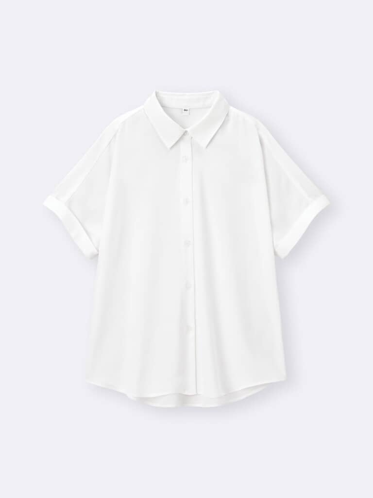 GUの「ドレープシャツ(半袖)」は素材にポリエステルを使用した、軽やかな着心地が特徴のシャツです。接触冷感機能が備わっているため、暑い日でもひんやりとした感触を楽しめます。また、シワになりにくいイージーケア仕様で、洗濯後もアイロン不要でそのまま着用できるのがうれしいポイント。