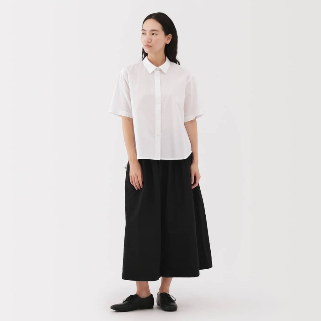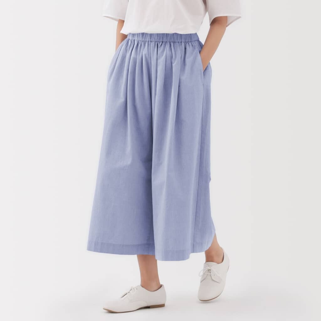一見スカートのように見えるボリューム感があるクロップドパンツで、デザイン性と動きやすさが両立されています。総ゴム仕様でウエスト紐で締め具合を調整できるので、好みのフィット感に調整できるのもうれしいですね。履き心地も見た目も涼しく、夏にぴったりの一着といえそうです。