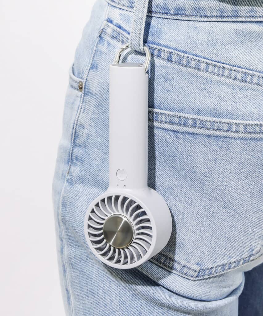第1位は、「ペルチェ付き2重構造ハンディファン」(税込み:1980円)でした。2重構造により直進性のあるパワフルな風を生み出す、冷却プレート付きハンディファンです。電源ボタンを連続で2回押すと冷却プレートが瞬時に温度低下し、肌に当てるだけで素早くクールダウン。風速は微弱からターボまで5段階切替が可能で、シーンに応じて最適な風量を選択できます。カラビナ付きでバッグやショルダーストラップに装着でき、カラビナを倒すと卓上スタンドとしても使用可能。充電式のため、電源のない場所でも使用できるのがうれしいですね。