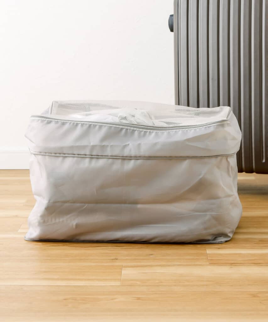 3COINSの「衣類圧縮バッグ:M」(税込み:550円)は、旅行時のパッキングをスマートにしてくれる衣類圧縮バッグ。改良されたファスナーは滑らかに閉まり、下部ファスナーを一周させるだけで厚みをぐっと抑えられます。表面は通気性に優れたメッシュ仕様で、収納物が一目で確認できるのが便利。Mサイズの収納目安は薄手のTシャツ(レディースMサイズ)20枚、トレーナー(レディースMサイズ)6枚です。また、インナーの整理に便利なSサイズも販売されています。
