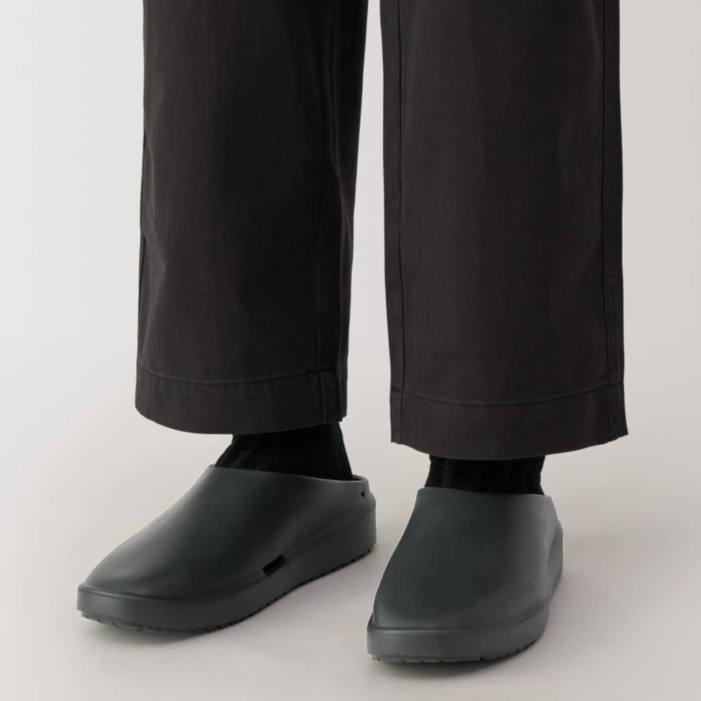 無印良品の「一体成型 サボサンダル」は、甲からソールまでEVA樹脂のみで成型した軽量モデル。素材自体が水を弾くため汚れても丸洗いでき、キッチンや小雨のちょっとした外履きにも重宝します。足裏にはクッション性をもたせ、アウトソールの凹凸パターンが滑りを抑制してくれるので長時間歩いても疲れにくい仕様です。