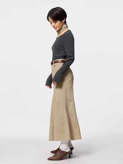 GUの「フレアマキシスカート+EC(丈短め85.0~89.0cm)」が、形がきれいで細見えすると人気を集めています。