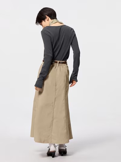 GUの「フレアマキシスカート+EC(丈短め85.0~89.0cm)」は、ウエストの後ろ部分にゴムを配し、着心地のよさを上げたスカート。くびれから裾へ向かって広がるフレアシルエットが動きに表情を添え、マキシ丈が縦のラインを強調します。適度なボリュームは足さばきを妨げず、階段や長距離移動でもストレスフリー。カラーは09 BLACK・32 BEIGEの2種類を展開しています。