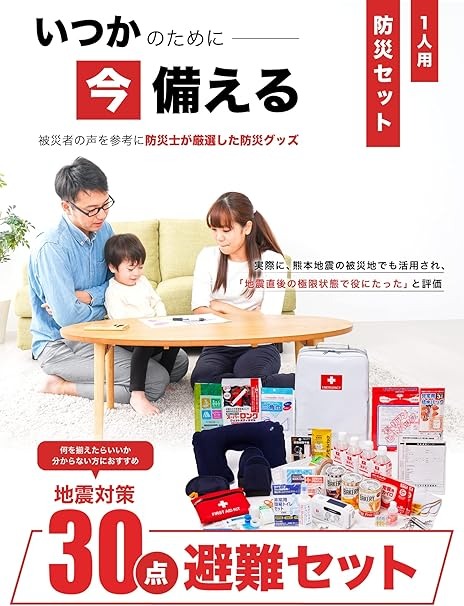 以下からは「防災士監修 防災セット (1人用) 地震対策30点 」の詳細画像とAmazonの「防災グッズ」人気ランキングTOP10を掲載しています!