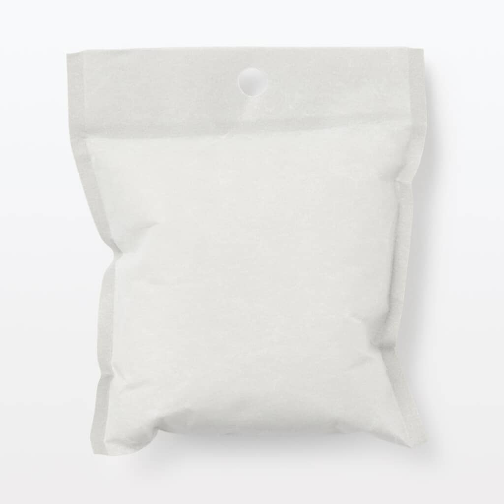 無印良品の「消臭機能付き くりかえし使える除湿剤」は、紙おむつにも用いられる高吸湿ポリマーを採用したコンパクトな小袋タイプの除湿剤です。10個入りで税込990円と手ごろ。靴箱や衣装ケース、クローゼットなど湿気がこもりやすい場所に置くだけで除湿と消臭を同時に行えます。本体は湿気を吸収した後、月1回程度を目安に風通しの良い日陰で乾かすだけで吸湿力が回復。繰り返し干すことで、最大約3年間使用可能です。