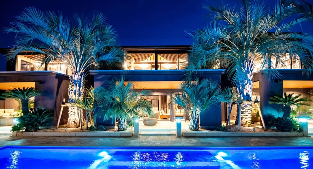 東茨城郡大洗町に位置する「サンライズヴィラ大洗」は、全棟オーシャンビューのラグジュアリーホテル。朝はフローティングブレックファースト、夜はライトアップが楽しめるガーデンプールを囲うようにゲストルームやバーラウンジ、ジャグジーなどが配置されたインドネシアのバリを彷彿とさせる施設です。全棟貸し切りのパーティープランも用意されており、結婚式の二次会や打ち上げ、パーティーなどにも利用できます。