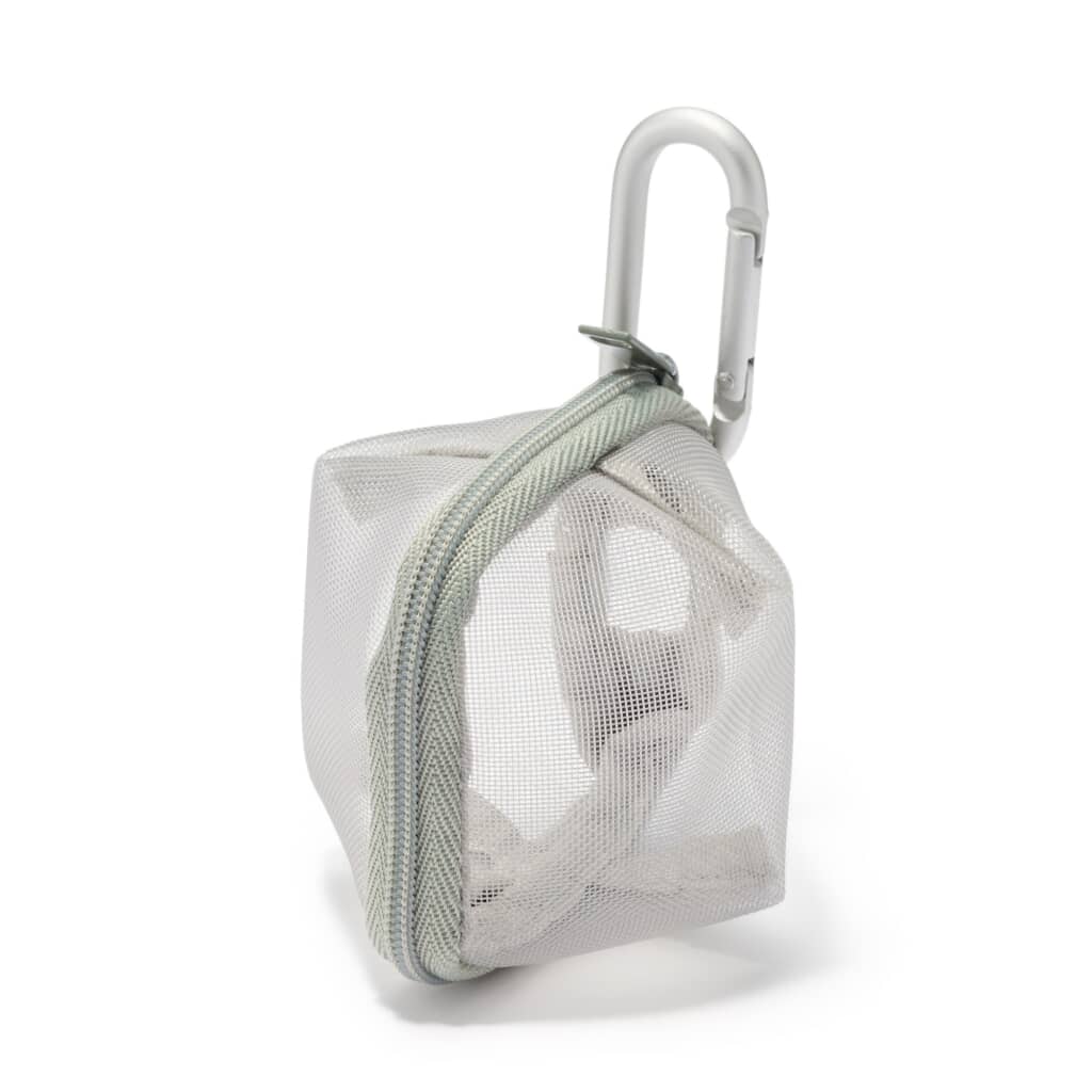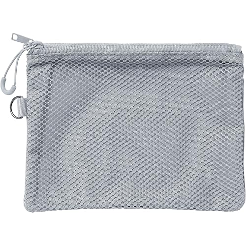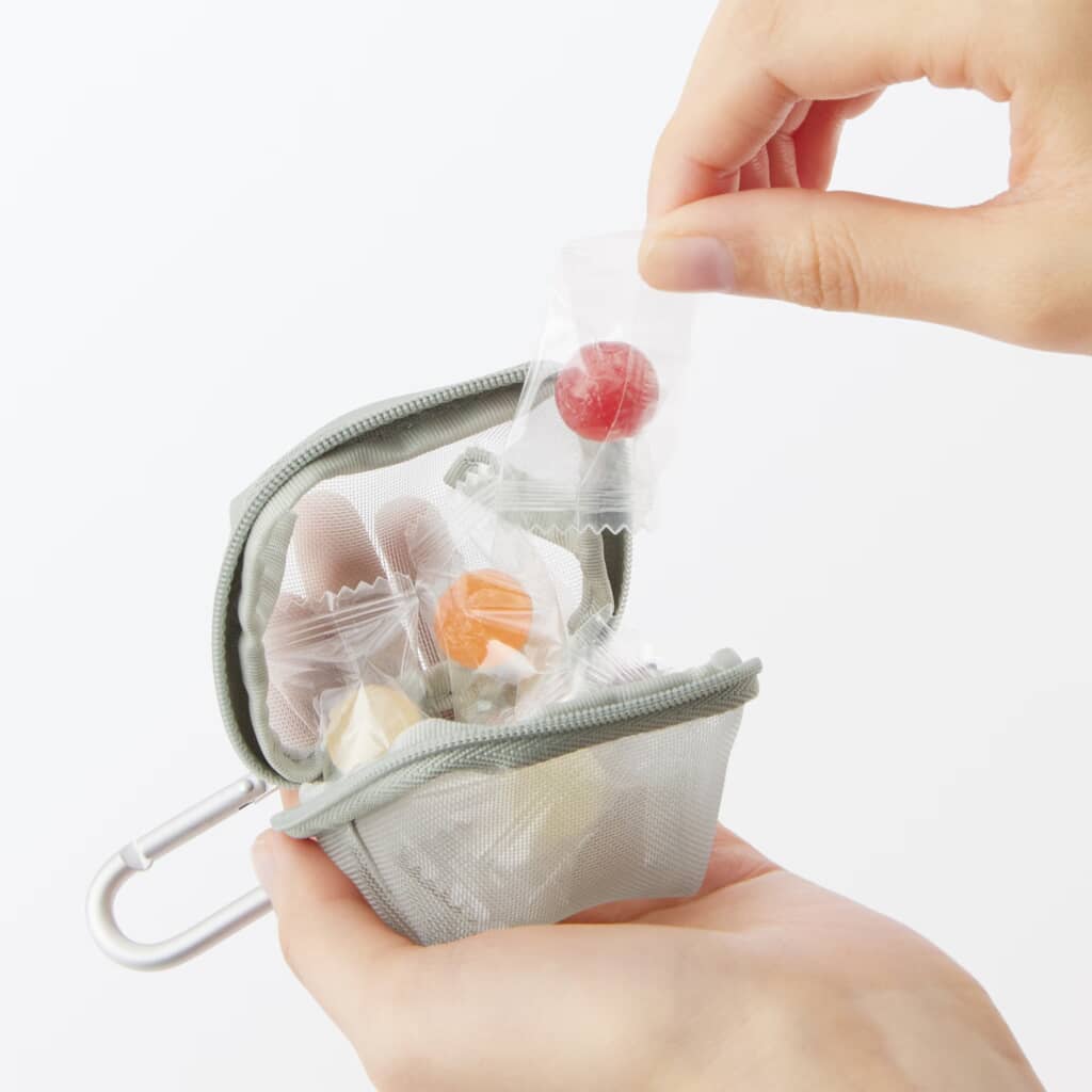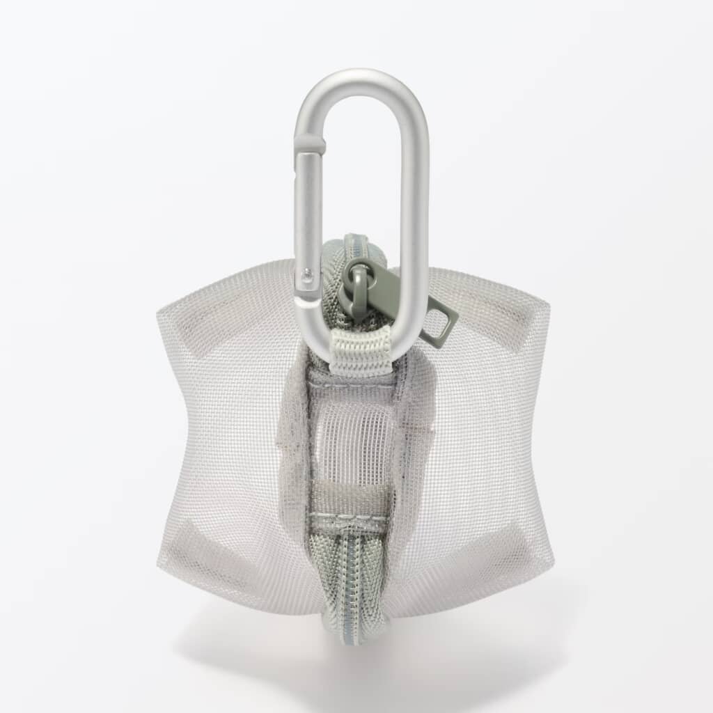 無印良品の「ナイロンメッシュ コンパクトポーチ」は、ハリのあるナイロンメッシュを使用したコロンとした立体ケースです。外寸は約7×6センチと手のひらサイズながらマチがあり、イヤホンや硬貨、目薬など厚みのある小物も収まります。前面がメッシュなので中身がひと目で分かり、ファスナーを大きく開けば出し入れもスムーズです。付属のアルミ製カラビナをバッグやベルトループに装着すれば、小物を探す手間が減るのも便利です。