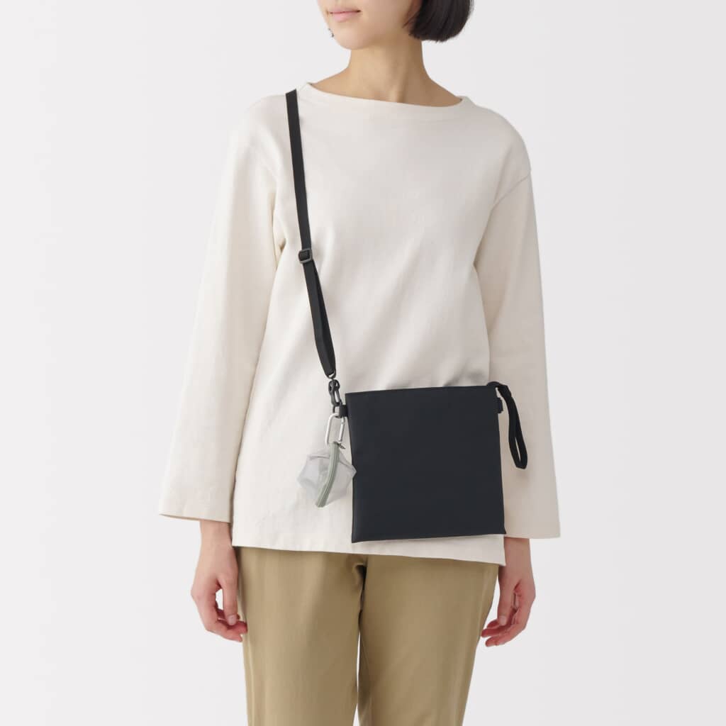 日本発のレザーバッグブランド「ダコタ」の「お財布ショルダーバッグ DA-1032460」は、お財布とバッグが一体化した、注目の多機能アイテム。お財布以上クラッチバッグ未満という、ほどよいサイズ感。無印良品の「ナイロンメッシュ コンパクトポーチ」をカラビナで引っかければ、目薬やイヤホンといったお財布ショルダーに入りきらないアイテムも一緒に持ち運べそうですね。