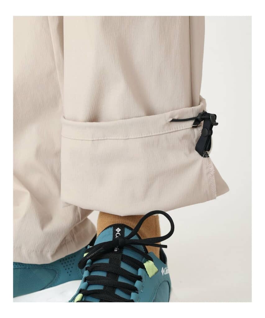 ウエスト部分にカジュアルなナイロンベルトを採用しており、フィット感の調整が簡単なうえに見た目のアクセントにも。両サイドのカーゴポケットは収納力も抜群で、スマホや小物などをサッと入れられて便利。裾にはドローコードが付いているので、シルエットの変化も楽しめるのが魅力です。