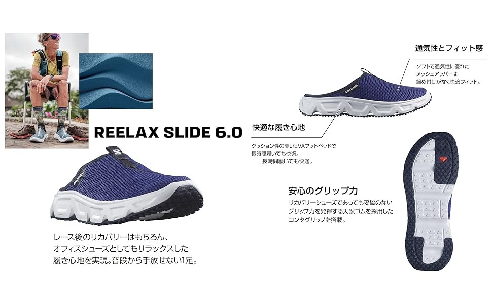 「REELAX SLIDE 6.0」は、スポーツ後の回復を目的に開発されたリカバリーサンダルです。通気性に優れた3Dメッシュアッパーがムレを軽減し、fuzeFOAM EVAの厚みあるミッドソールが着地衝撃を和らげます(天然ラバーを最大30%配合)。足裏に沿う成型EVAソックライナーがフィット感を高め、ノンマーキングContagrip®アウトソールは濡れた路面でもグリップ力を発揮します。