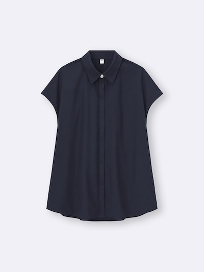GUの「ビジューボタンブラウス(半袖)Z」は、胸元でジュエリーのように輝くビジューボタンをあしらった華やかなブラウスです。ゆとりのあるシルエットとフレンチスリーブが肩まわりを程よく隠し、体形を選ばず上品な印象に導きます。前立ては比翼仕立てで肌当たりがやさしく、ボタンのきらめきをアクセサリー感覚で楽しめる設計です。素材はリサイクルポリエステル主体でシワになりにくく、洗濯機洗いOKとデイリーケアも簡単。カラーはオフホワイト・ブルー(ストライプ)・ネイビーの3色です。