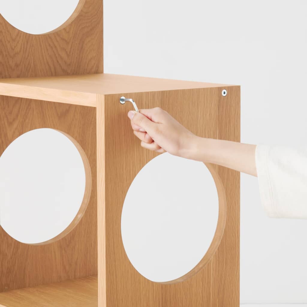 1段目の穴なし区画はフードやおもちゃの収納に便利。オーク材突板仕上げで既存のスタッキングシェルフと連結可能、付属の転倒防止金具で安定感を高められます。価格は税込3万9900円です。