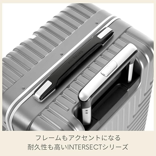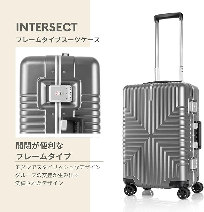 サムソナイト「インターセクト スピナー55/20 FR」は、ポリカーボネート製シェルに光沢アルミフレームを組み合わせたハードケースです。縦横に走る溝が交差するボクシーなデザインで容量を確保しつつ、サイズ約55.0×約36.0×約24.0センチ・容量34リットル・重量3.3キログラムと機内持ち込みに対応。360度回転のダブルホイールが凹凸路面でも滑らかな走行を実現し、内装にはウェットポケットや小物ポケット、荷崩れ防止ストラップを装備。週末旅行や1〜2泊の出張を安心してサポートします。