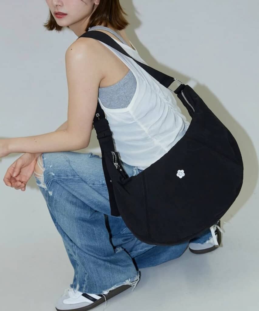 「ワンポイント刺繍 ナイロン ショルダーバッグ 限定展開」は、MARY QUANT×PUBLUXのリミテッドモデル。店舗での販売はなく、ウェブ販売のみの限定展開アイテムです。マットなナイロン素材を採用した軽量ショルダーバッグで、マリクワのアイコンであるフラワーモチーフ刺繍と、PUBLUXらしいカジュアルデザインの組み合わせが最大の魅力。長めのショルダーベルトは肩掛けから斜め掛けまで調整可能で、アクセントとしても映えます。