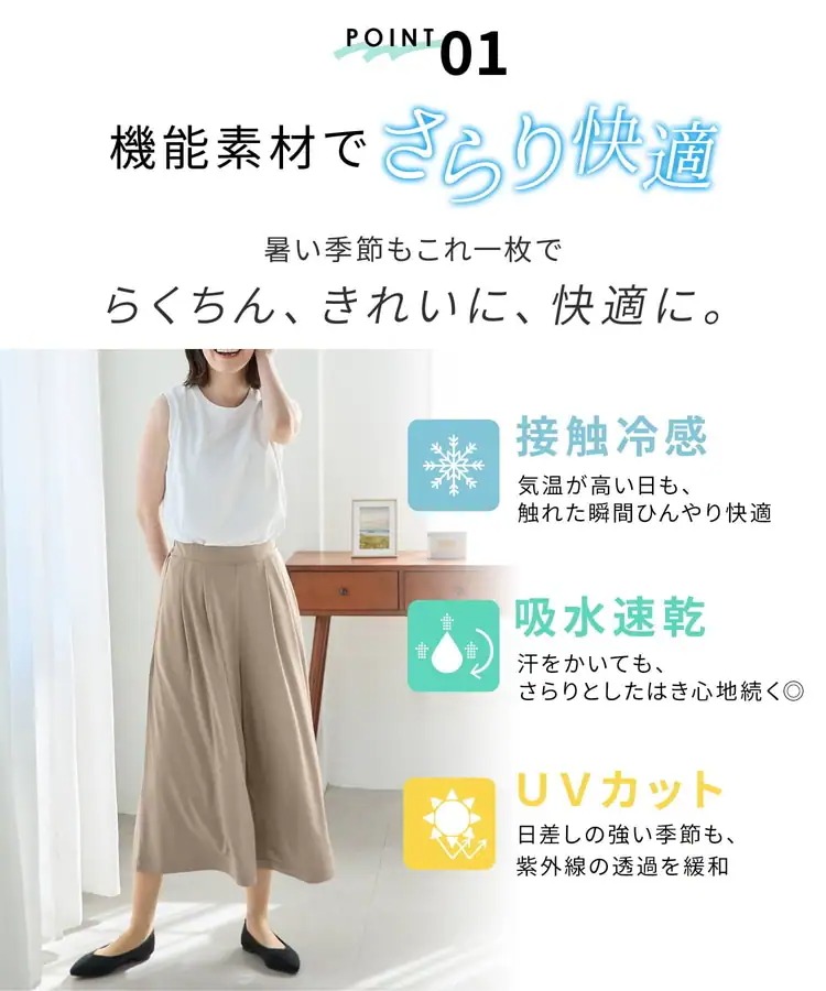 「カット素材ガウチョパンツ」は、スカートのような優雅なシルエットと、パンツの快適さを兼ね備えたアイテムです。ポリエステルを使用したカットソー素材は、滑らかな肌触りと上品な光沢感が特徴で、ストレッチ性に優れ、ウエストはゴム仕様で、長時間の着用でもストレスフリーな履き心地を実現しています。また、吸水速乾や接触冷感、UVカット機能も備えており、暑い季節でも快適に過ごせます 。