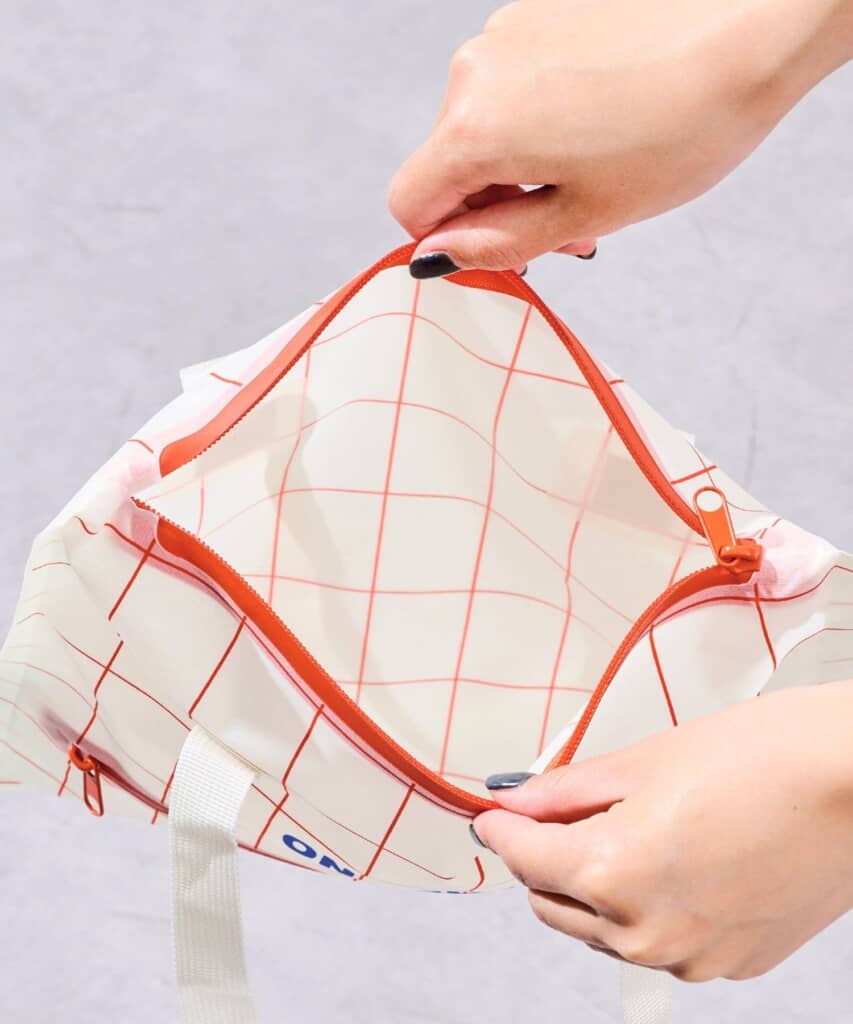 3COINSの「防水加工衣類ポーチ」(税込み:660円)は、内側に防水加工を施し、濡れた水着やタオルをそのまま入れて持ち運べるアイテム。海や川、プールなど夏のレジャーシーンで大活躍し、砂や水滴を気にせず使えます。フロントに付いたチャック付きポケットには、小物を分けて収納できるので整理もスムーズ。濡れ物と貴重品を賢く仕分けられる、夏のお出かけに欠かせないアイテムです。持ち手は程よい長さがあるので、トートバッグのように肩から掛けられるのも使いやすいですね。