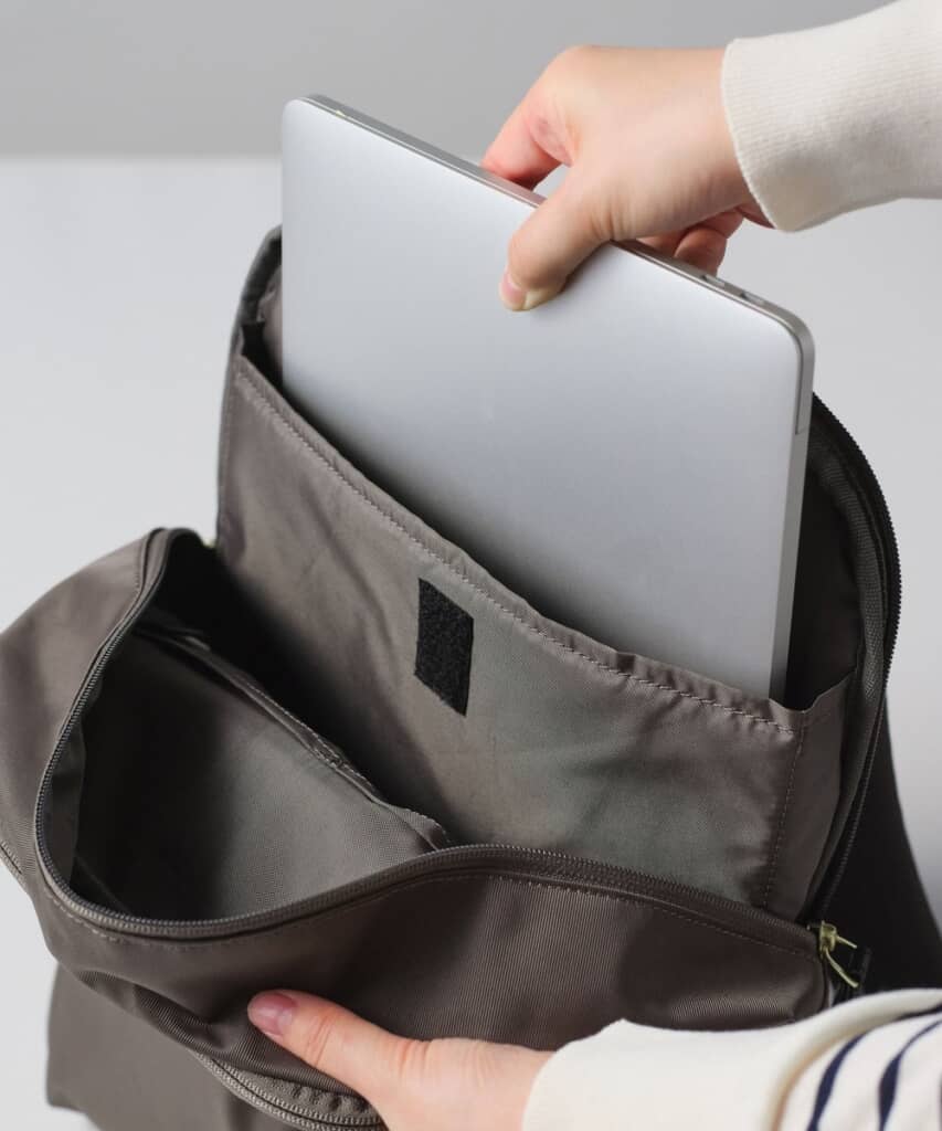 そんなアフタヌーンティーの雑貨ブランド「アフタヌーンティーリビング」と、バッグメーカー「エース」のコラボレーションによって誕生したリュックは、日々の生活に寄り添う機能性と上品なデザインを兼ね備えたアイテム。メイン収納はダブルジップ仕様となっており、背中側寄りに開く設計がポイント。ノートPCの出し入れがしやすいよう配慮されており、PCを日常的に持ち歩く人にもおすすめです。容量は、ペットボトルやお弁当、折りたたみ傘などもしっかりと収まるサイズ感。小分けに便利なポケットも充実しており、荷物の整理がしやすいのもうれしいポイントです。