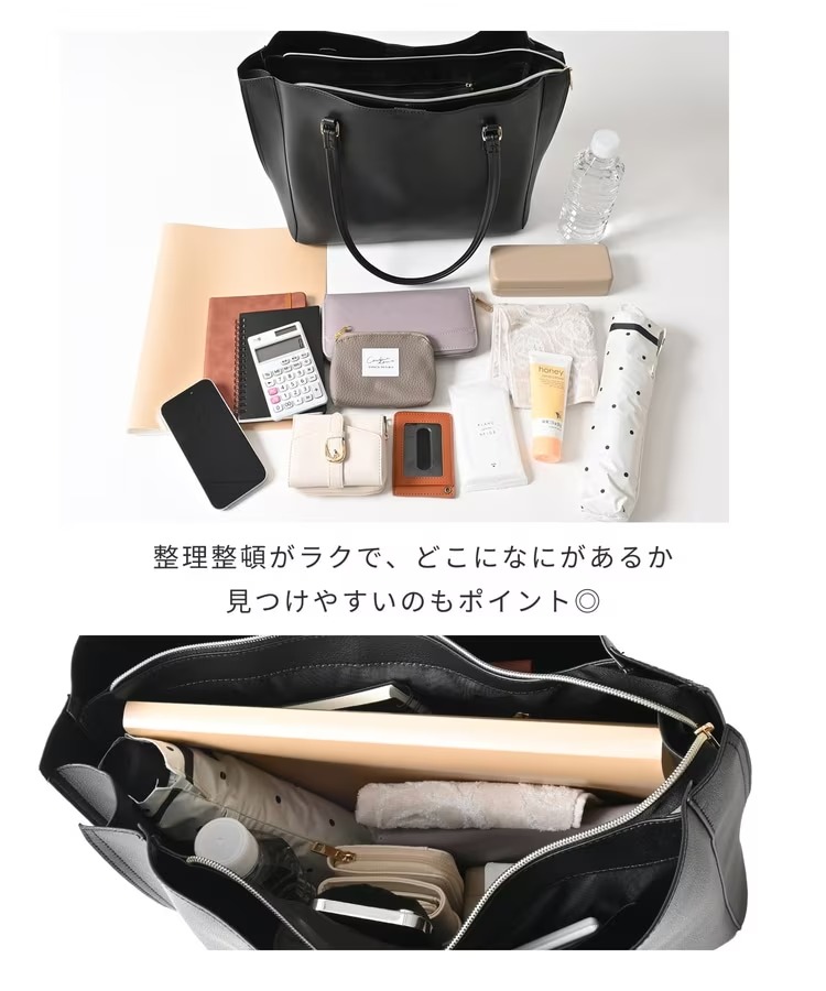シンプルかつ上品なフォルムはオフィススタイルにもぴったり。カラーバリエーションも豊富で、ブラックやアイボリー、ブルーグレーなどを展開しており、装いに合わせて選べる実用的なトートバッグです。