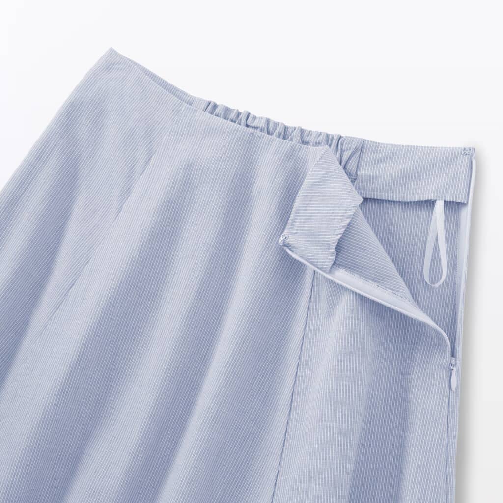 無印良品の「婦人 涼感フレアスカート」は、強撚糸で凹凸を出したシアサッカー生地のフレアスカートです。さらりとした肌離れと涼感素材、生地表面の細かな凹凸が接触面を減らし、汗ばむ季節でもべたつきを抑えるのが魅力。ウエストは前すっきり、後ろゴムで快適です。緩やかに広がるフレアスカートはスニーカーやサンダルとも合わせやすく、真夏も軽やかな装いを演出します。やや透け感があるため、ペチコート着用がおすすめです。