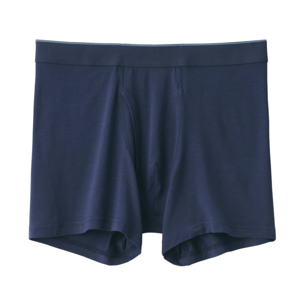 無印良品の「紳士 なめらか 前開きボクサーパンツ」は、締め付け感の少ないウエストゴムを採用し、通気性に優れ快適な穿き心地を実現したパンツ。主素材にはユーカリ由来の再生繊維リヨセルを使用しており、蒸れにくく吸放湿性が高いため、汗ばむ季節でも快適です。接触冷感性のある生地と、やわらかでしっとりとした肌触りも魅力。背面のステッチにより立体感を持たせ、より自然なフィット感を追求しています。