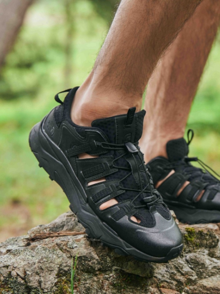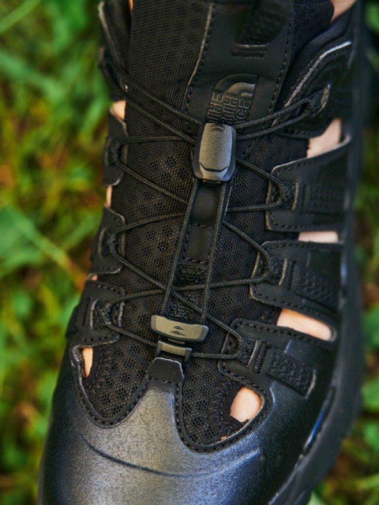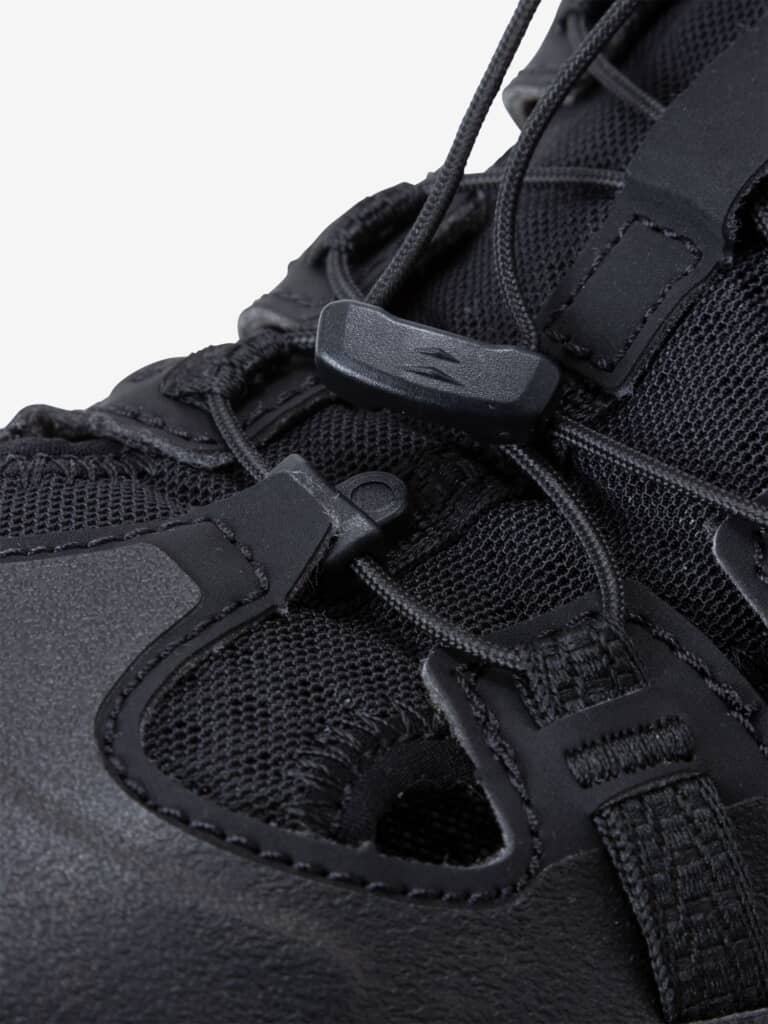 アッパーには、軽量で丈夫な人工皮革とメッシュ素材を組み合わせたスリットデザインを採用。通気性が高く、暑い日でも快適に過ごせます。インソールにも通気性とクッション性に優れたパンチングメッシュを使用しており、素足でも快適な履き心地を実現。ソールユニットには、歩行時のブレを抑えつつ推進力を高める3D TPUプレートと、クッション性に優れたロッカー構造のEVAミッドソールを搭載。グリップ力の高いSURFACE CTRLアウトソールは、ぬれた路面や起伏のある地面でもしっかりと足元を支えてくれます。クイックシューレースを採用しているのも特徴で、引っ張るだけでさっとフィット感を調整できるのが便利なポイント。末端にはマグネットコードエンドがついており、余ったコードがブラブラしないようにスマートにまとめることができます。