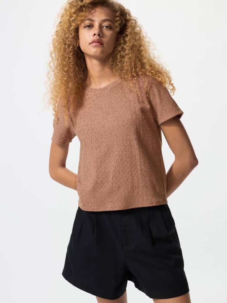ユニクロの「シャーリングT」は、やわらかなシャーリング加工が特徴のレディース半袖トップスです。