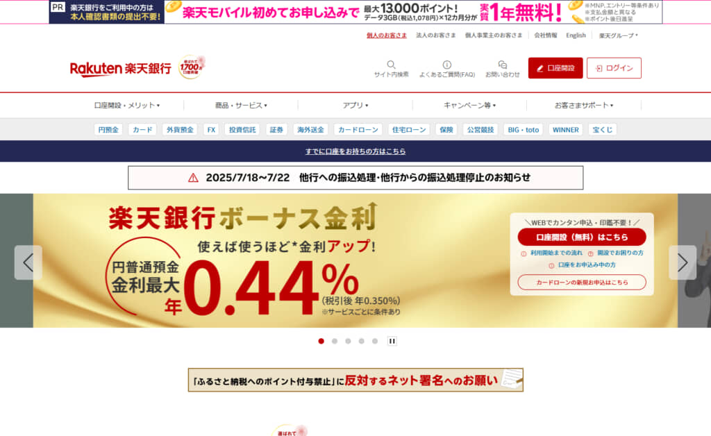 「ハッピープログラム」へのエントリー後に残高額や取引件数といった条件を満たすと、ATM利用や振り込み手数料の優待を受けられるようになります。取引ごとに楽天ポイントも貯まるので、楽天経済圏のサービスを利用している人は特にうれしいですね。